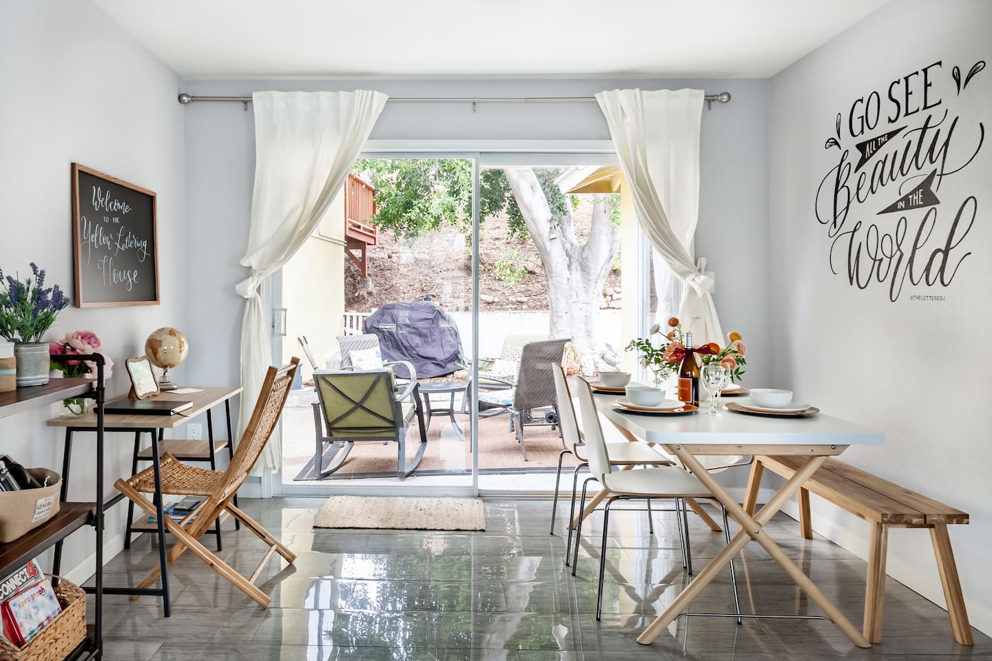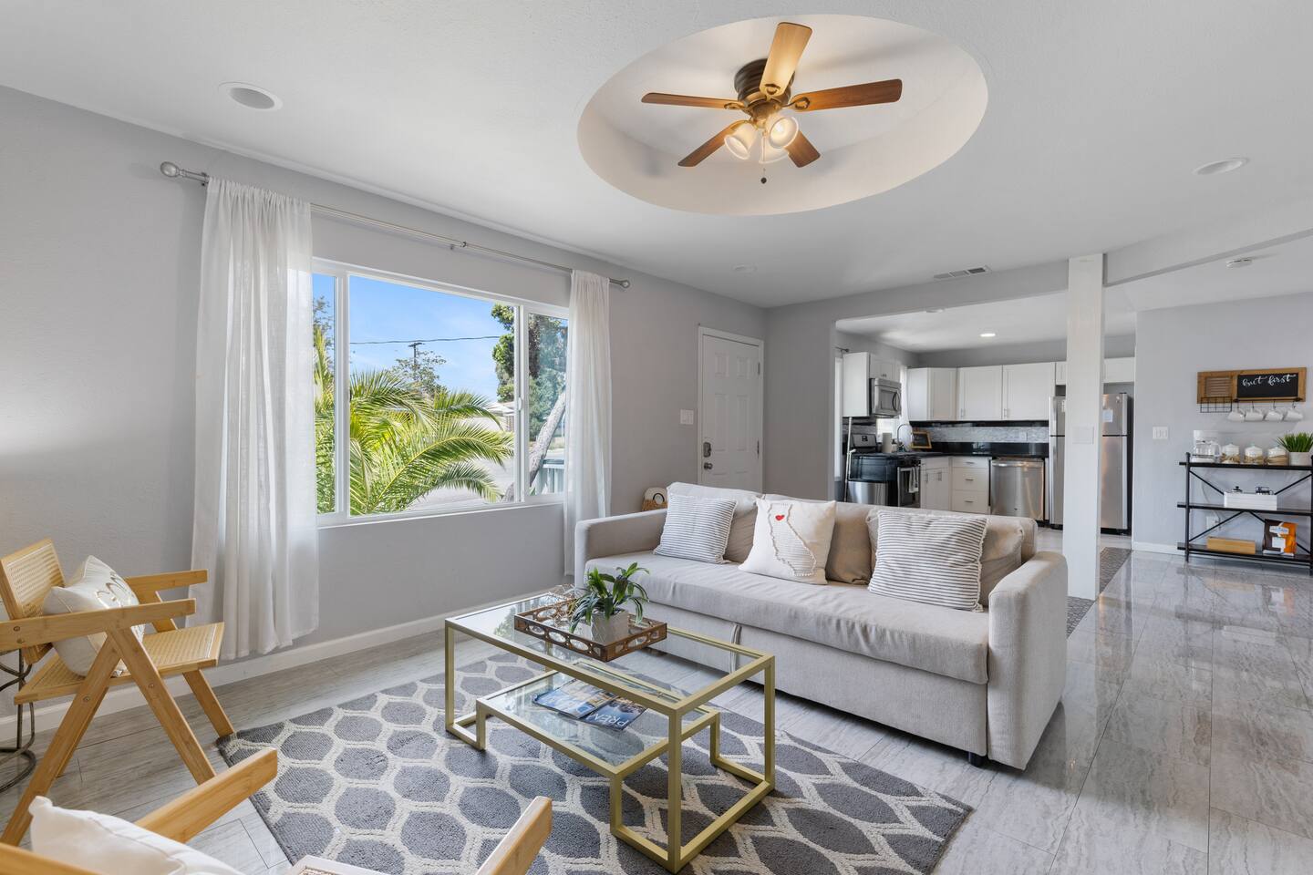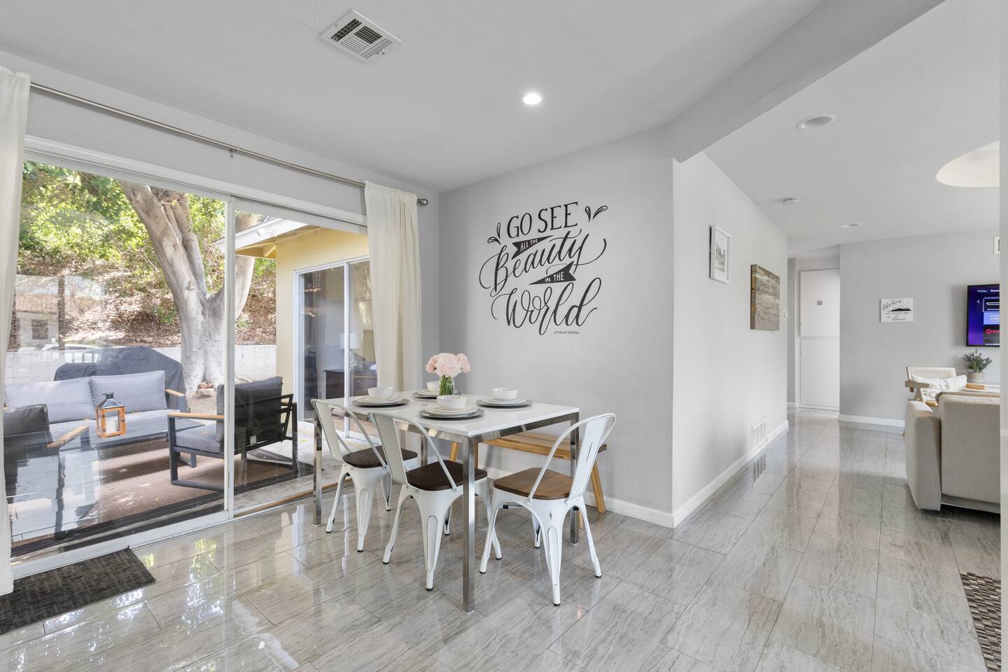 Enjoy the peaceful charm of a patio nestled under lush trees, perfect for sipping freshly brewed coffee. This renovated artsy home exudes warmth with sleek floors, elegant furnishings, and mural walls by local artists. Inside, the open living room is a chic sanctuary with modern decor, creating an inviting space to relax or socialize. The flow continues into the fully stocked kitchen and dining area, ideal for preparing breakfast or hosting intimate dinners.