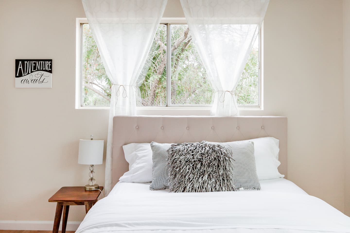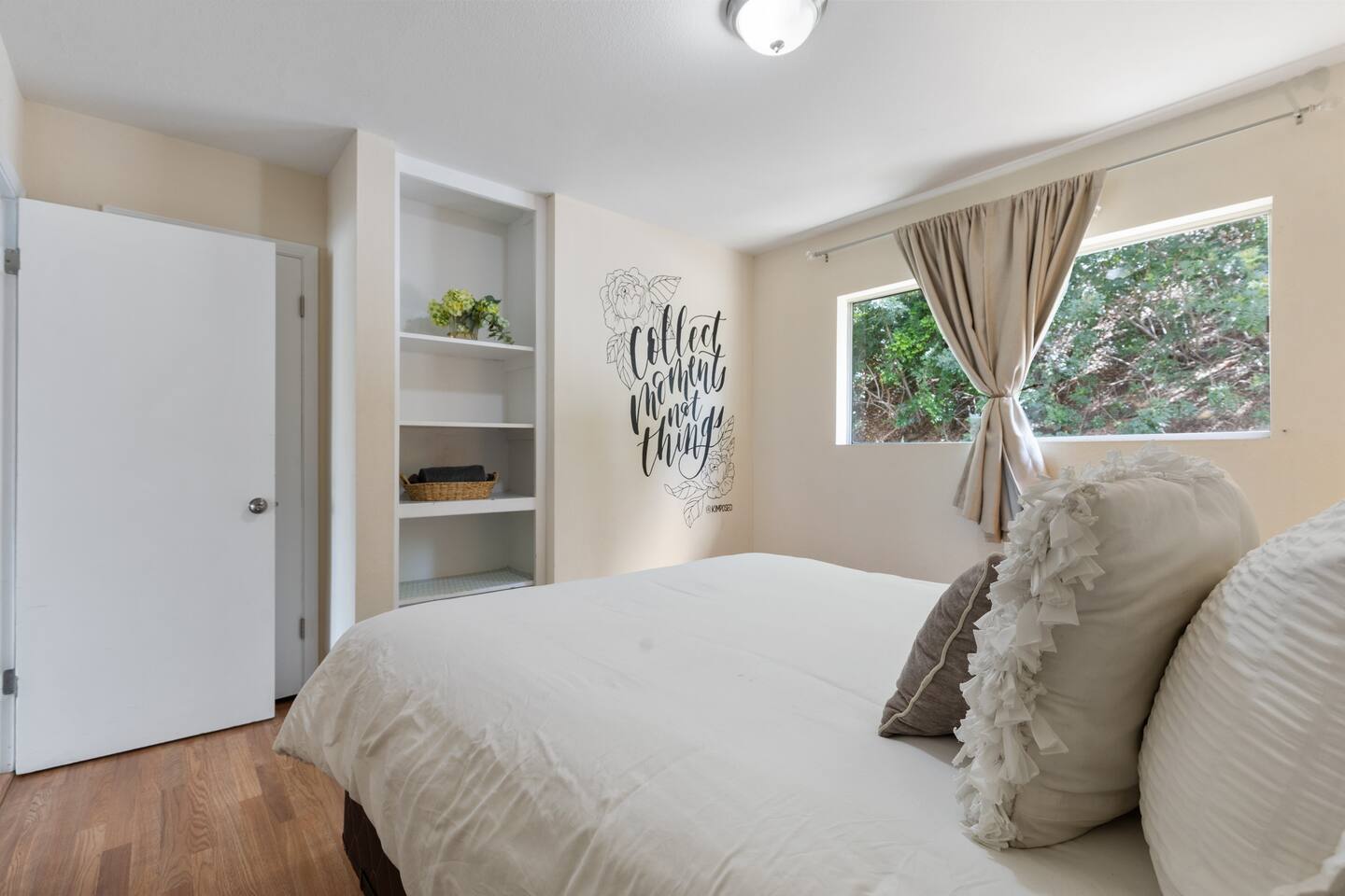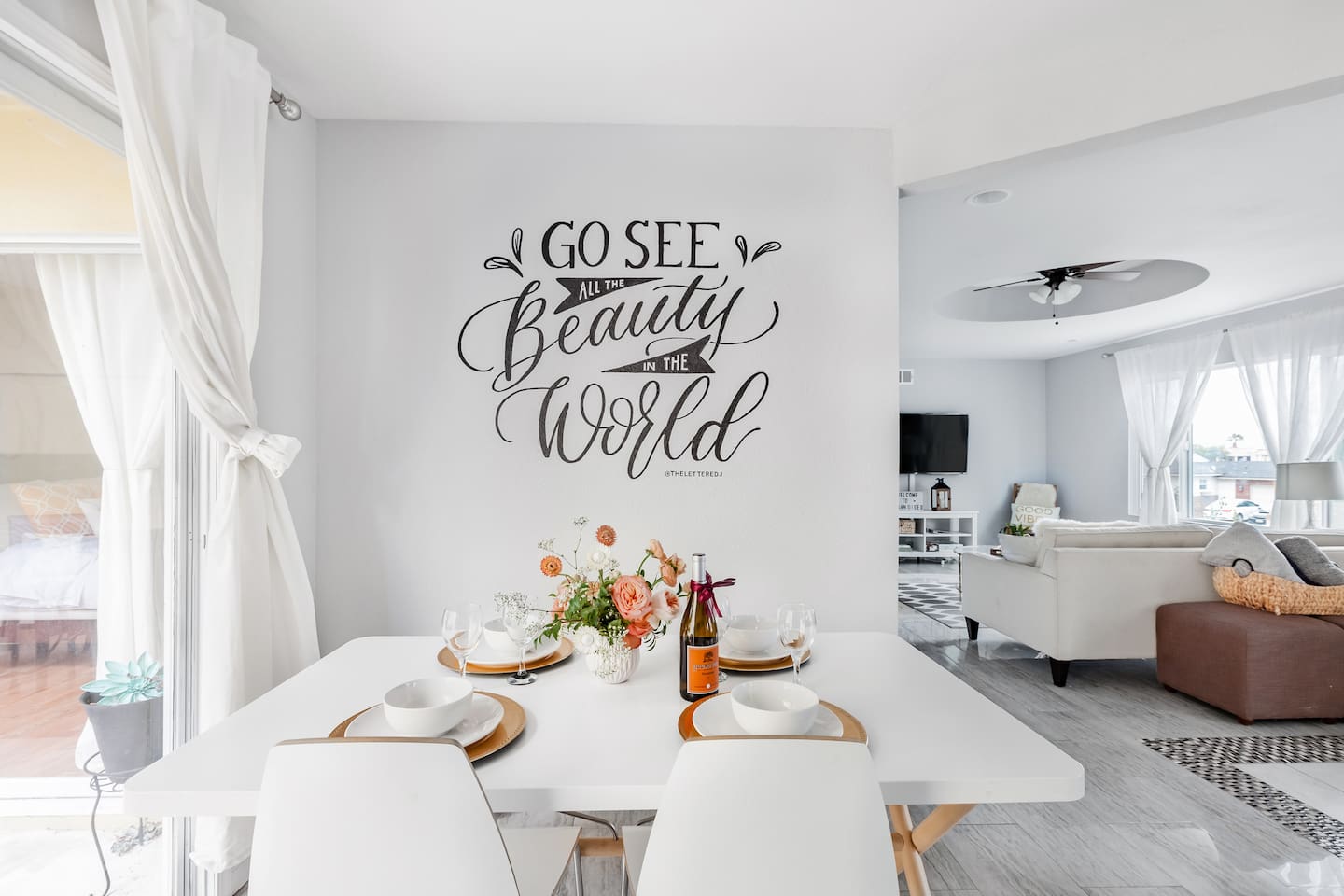 Enjoy the peaceful charm of a patio nestled under lush trees, perfect for sipping freshly brewed coffee. This renovated artsy home exudes warmth with sleek floors, elegant furnishings, and mural walls by local artists. Inside, the open living room is a chic sanctuary with modern decor, creating an inviting space to relax or socialize. The flow continues into the fully stocked kitchen and dining area, ideal for preparing breakfast or hosting intimate dinners.