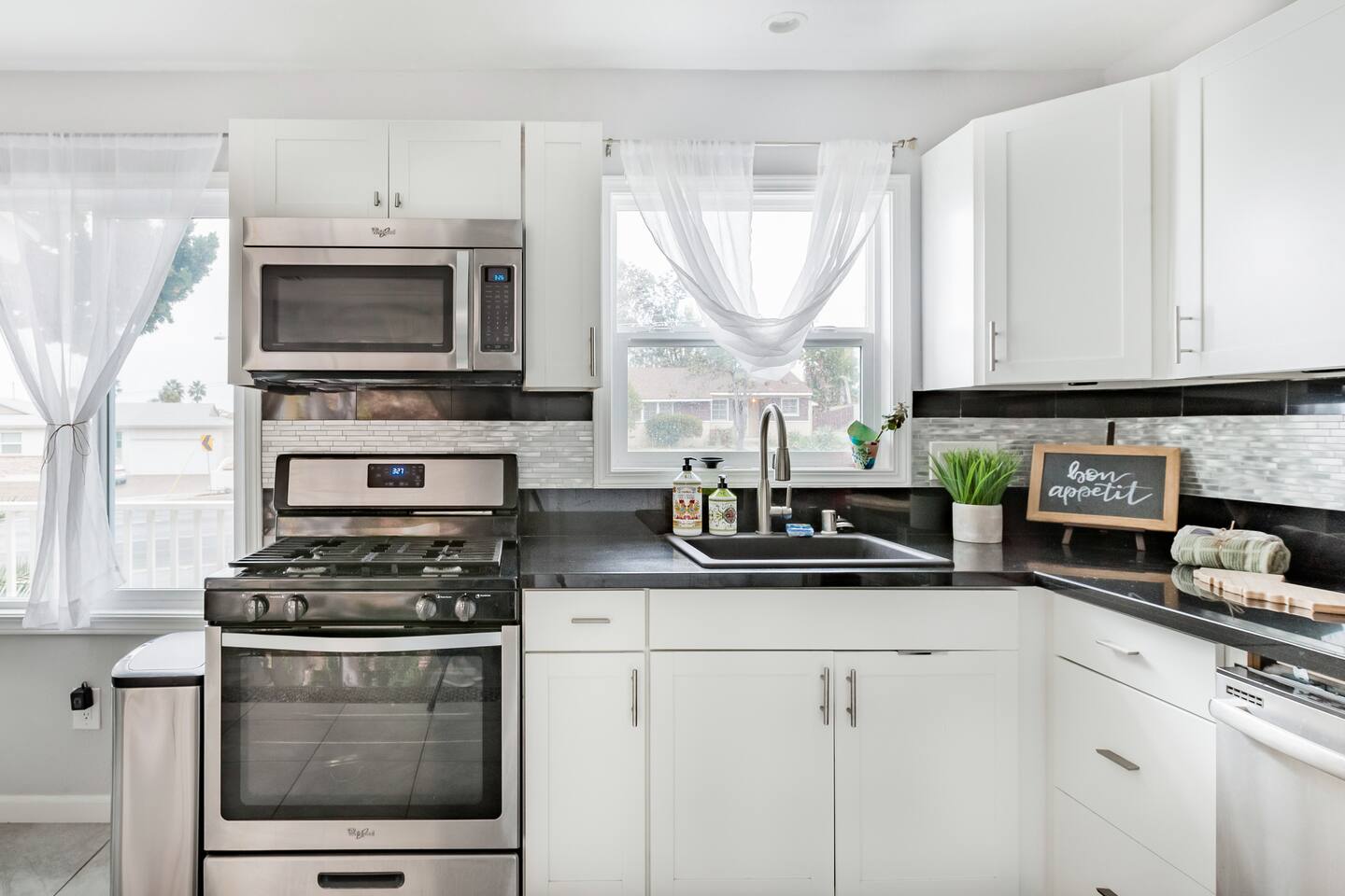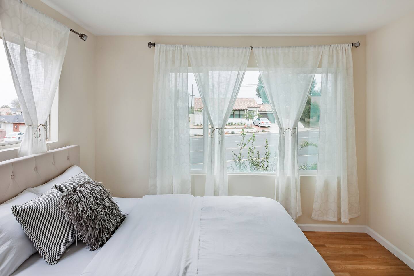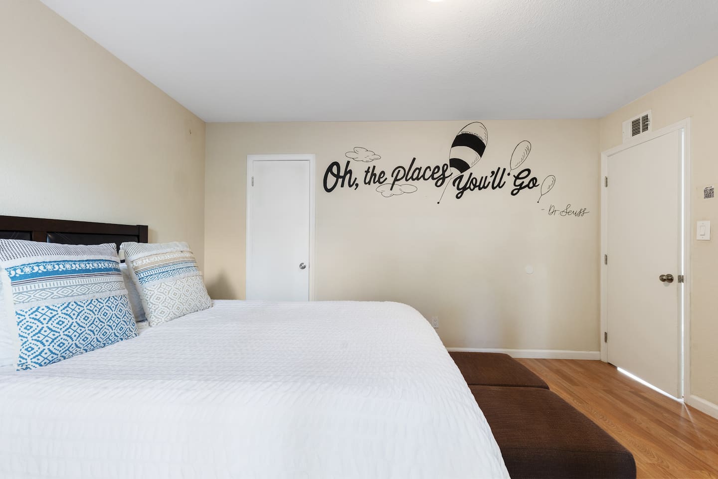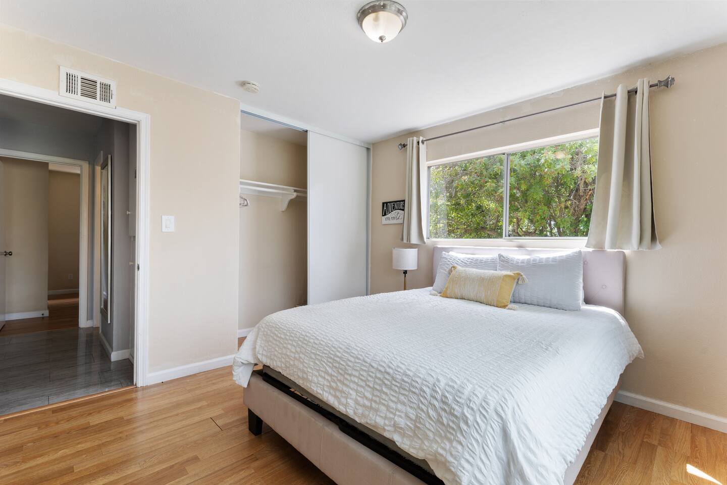 Welcome to our stylish and inviting 3-bedroom, 2-bathroom single-level home, where local artistry meets modern comfort. Adorned with vibrant murals from talented local artists, this home offers a unique and inspiring atmosphere. Inside, you'll find stylish and comfy bedding, ensuring a restful night's sleep after a day of exploration. The open kitchen layout and dining area provide the perfect space for cooking and enjoying meals together, complete with a convenient desk for work-from-home professionals. Step outside to the furnished outdoor patio, where you can fire up the BBQ grill and savor delicious meals al fresco. With 2 reserved parking spots in the driveway, parking is a breeze. Please note that as the home is located on a main street, we provide amenities such as a white noise machine and disposable earplugs for guests who may be sensitive to noise, ensuring a peaceful and comfortable stay for all. Experience the perfect blend of style and convenience in our charming single-level home. Book your stay today and make unforgettable memories in San Diego! Sleeping Arrangements Master Bedroom: Queen-sized bed, wall-to-wall closet, en-suite bathroom with shower (no tub), and peaceful views of the backyard. Bedroom 2: Queen-sized bed, closet with built-in shelves, also facing the backyard—quiet and cozy. Bedroom 3: Queen-sized bed, wall-to-wall closet, with views overlooking the front street. Living Area An open-concept layout combining the kitchen, living room, and dining area with a 6-seater dining table. Features a Smart TV and a coffee station for your morning pick-me-up. Laundry: Shared washer & dryer located in the laundry room, accessible via the back driveway (shared with the guest house). Pet Policy: Dogs only. We welcome one dog per reservation—please add your pet to your booking and pay the applicable pet fee. For the comfort of all guests, dogs are not permitted on beds or furniture. An additional cleaning fee may apply for excessive hair. Kindly clean up after your pet to avoid any extra cleaning charges.