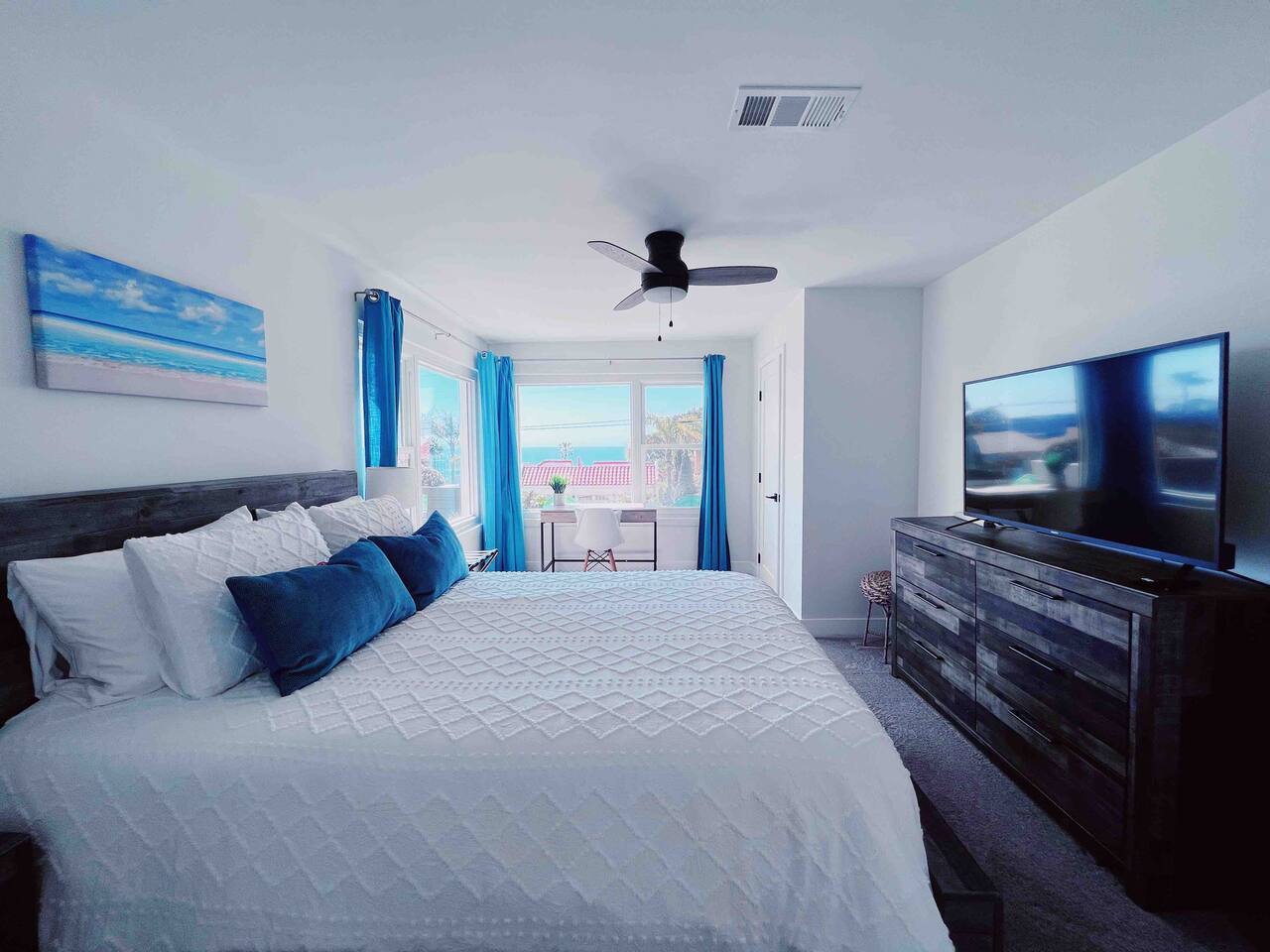 Introducing our recently constructed and remodeled guest suite, boasting a generous 1300 sq. ft. of space, professionally decorated with a tasteful coastal vibe. This spacious retreat features 2 bedrooms and 2 baths, complete with a washer & dryer for added convenience. Embracing eco-friendly living, the suite is equipped with solar power, supported by Tesla batteries, ensuring the entire home has been "off the grid" since January 2022. Enhancing your comfort, each room is equipped with a ceiling fan to keep you cool during warm days. Additionally, enjoy stunning ocean views from every bedroom and the living room, providing a picturesque backdrop to your stay. To further elevate your experience, we provide environmentally friendly cleaning and shower products for your comfort and peace of mind. Convenience is key, with ample free public parking available on the street in front of the house. Additionally, we offer a range of amenities to elevate your beach experience, including books, games, beach chairs, a boogie board, umbrella, and beach towels - everything you need for an enjoyable day by the sea. Experience the perfect blend of luxury, sustainability, and coastal charm at our guest suite. Book your stay today and immerse yourself in the ultimate beachside retreat.Please note that you must climb stairs from the street level to get up to the door/entrance to unit, this is the only way to enter, please see listing photos. Also note there is no AC, which generally isn't an issue on the coast. We have ceiling fans. Living Room: Open- living room with dining area with OCEAN VIEW, separated kitchen with high end appliances including DISHWASHER Master-bedroom: Queen sized bed, DESK, OCEAN VIEW, amble closet, dresser, TV, Ensuite Master Bathroom Bedroom #2: Queen Sized bed, regular size closet, and OCEAN VIEW Outdoor space: Furnished with BBQ Grill, beach chairs, OCEAN VIEW 1 COMPLIMENTARY charging for your electric vehicle