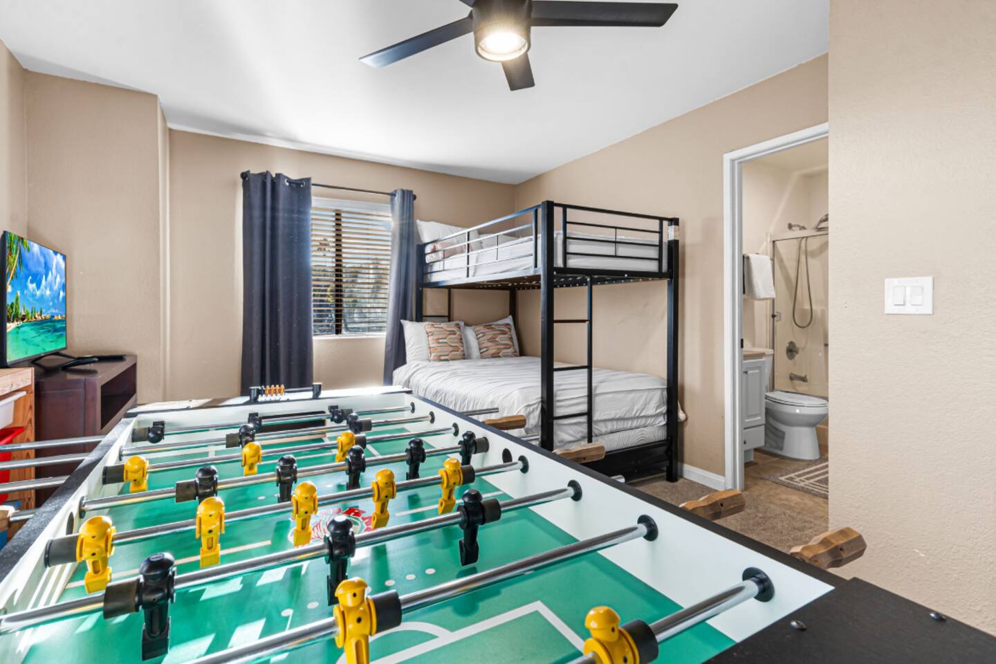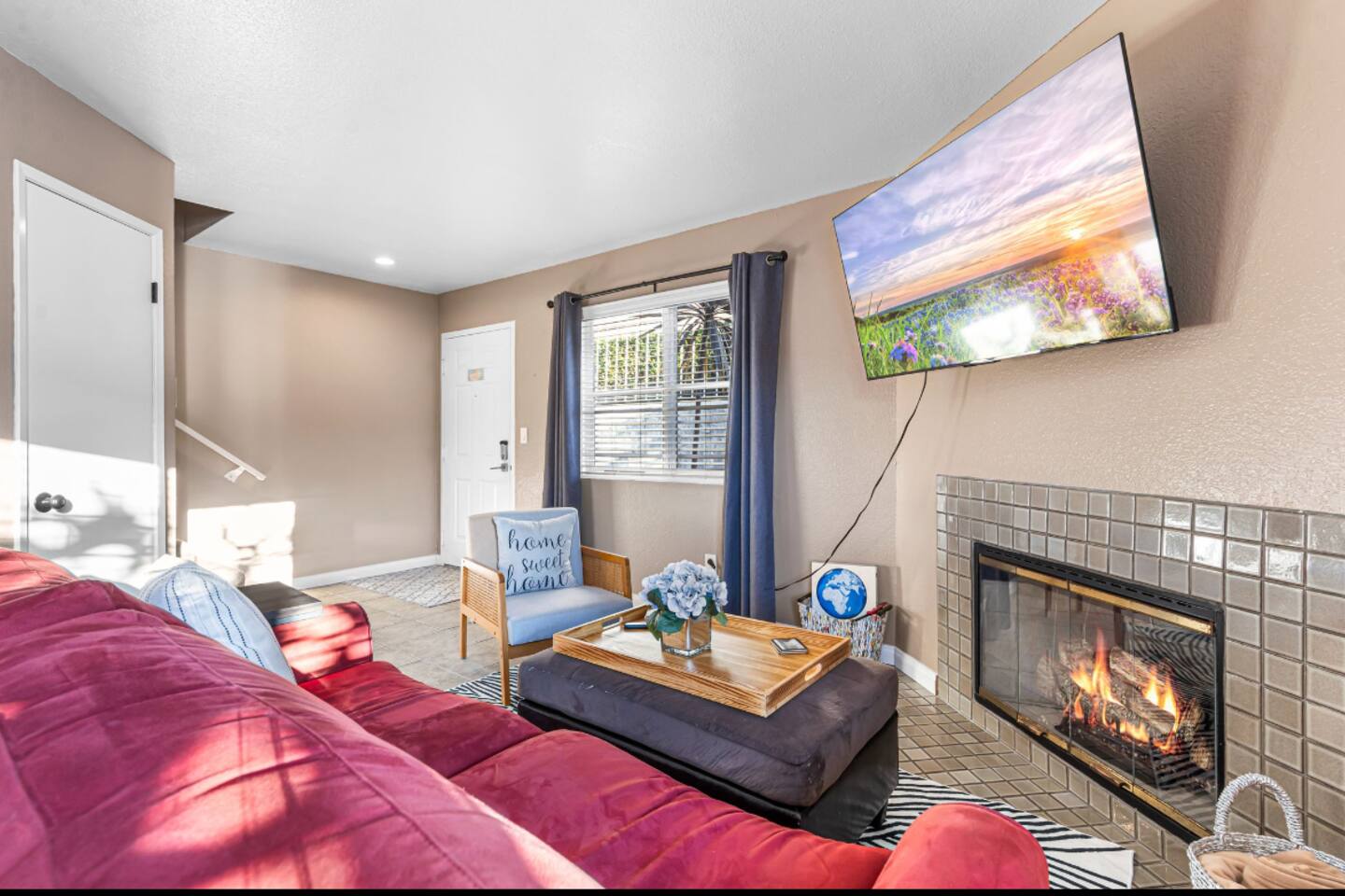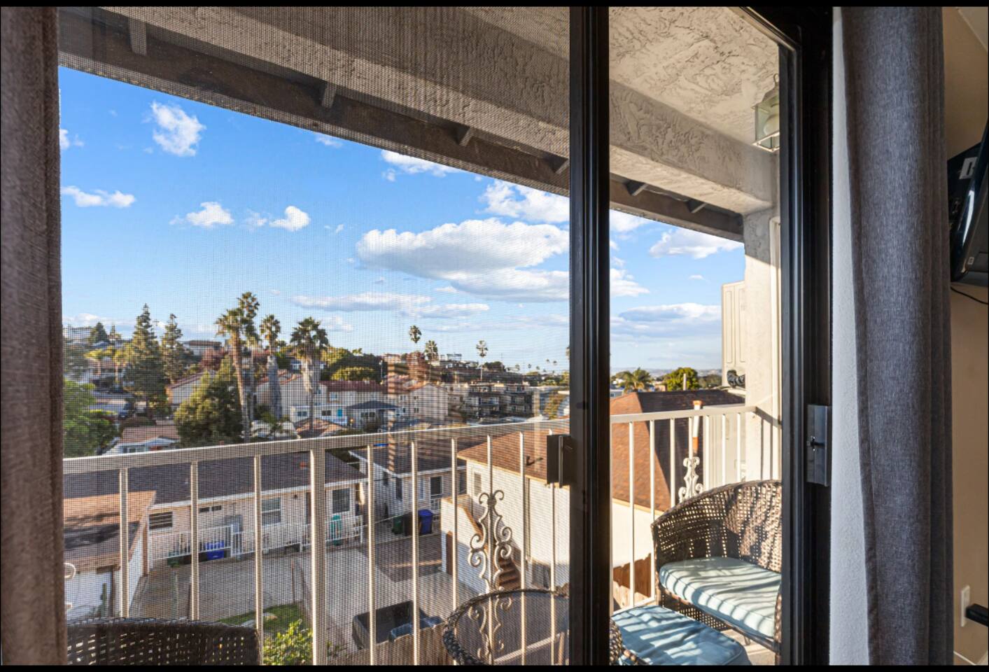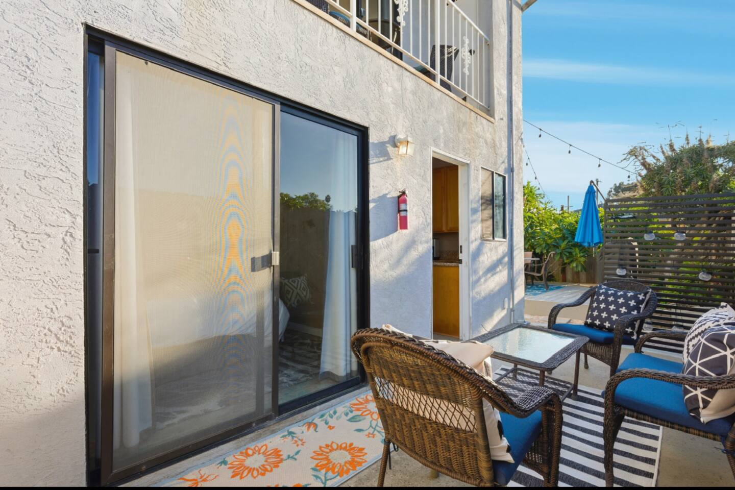 Welcome to your Point Loma retreat! This spacious two-level apartment features 3 bedrooms and 3 full bathrooms, with two bedrooms located upstairs for added comfort and privacy. Enjoy two private balconies and a private patio—perfect for morning coffee, fresh ocean air, or unwinding after a day of exploring San Diego. The open-concept living area offers cozy seating and plenty of natural light, while the shared outdoor space includes a BBQ grill and jacuzzi, ideal for relaxing evenings or a casual gathering. Whether you're looking for a peaceful getaway or a fun stay with friends and family, this home has everything you need. LIVING ROOM & KITCHEN: Settle into a warm, inviting living space with comfortable furnishings and an indoor fireplace. The fully equipped kitchen opens directly to a private patio, making it easy to cook, dine, and relax. A full-size bathroom with a walk-in shower is also conveniently located on this level. DOWNSTAIRS BEDROOM: A cozy queen-sized bedroom is located on the main floor—perfect for guests who prefer to avoid stairs. UPSTAIRS BEDROOMs: Master Bedroom Enjoy a serene king-sized bed, a private ensuite bathroom, and your own balcony where you can sip your morning coffee or take in sunset views. Guest Bedroom Perfect for families or groups, this room features an XL twin-over-queen bunk bed, a foosball table for added fun, and a private ensuite bathroom. SHARED BACKYARD Relax and enjoy a welcoming shared outdoor space complete with a BBQ grill, outdoor dining area, and a 7 person hot tub—ideal for unwinding or hosting a small get-together. MUST KNOW This property is located in the heart of Point Loma, within the airport flight path. You may hear airplane noise between 6:30 AM and 11:30 PM while outdoors. Indoors, with doors and windows closed, the noise is generally minimal. If you’re sensitive to noise and prefer to keep windows open, this may not be the ideal fit for you. NEED BIGGER SPACE? We also have another 3-bedroom, 3-bath unit available in the same building. If your group needs extra space, feel free to let me know—it's perfect for large families or friends who want to stay close to each other.