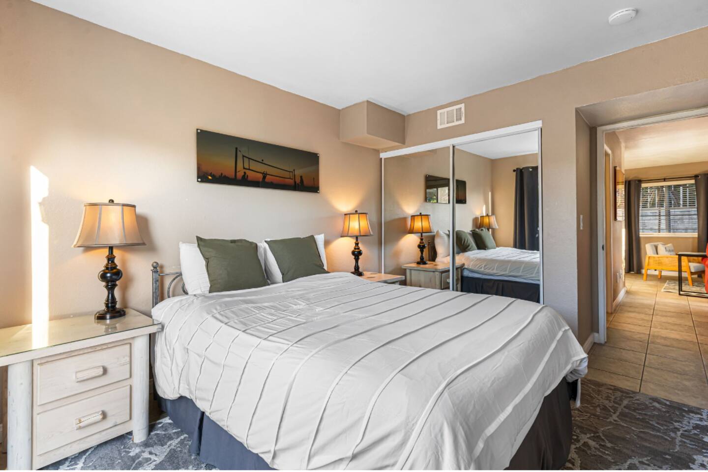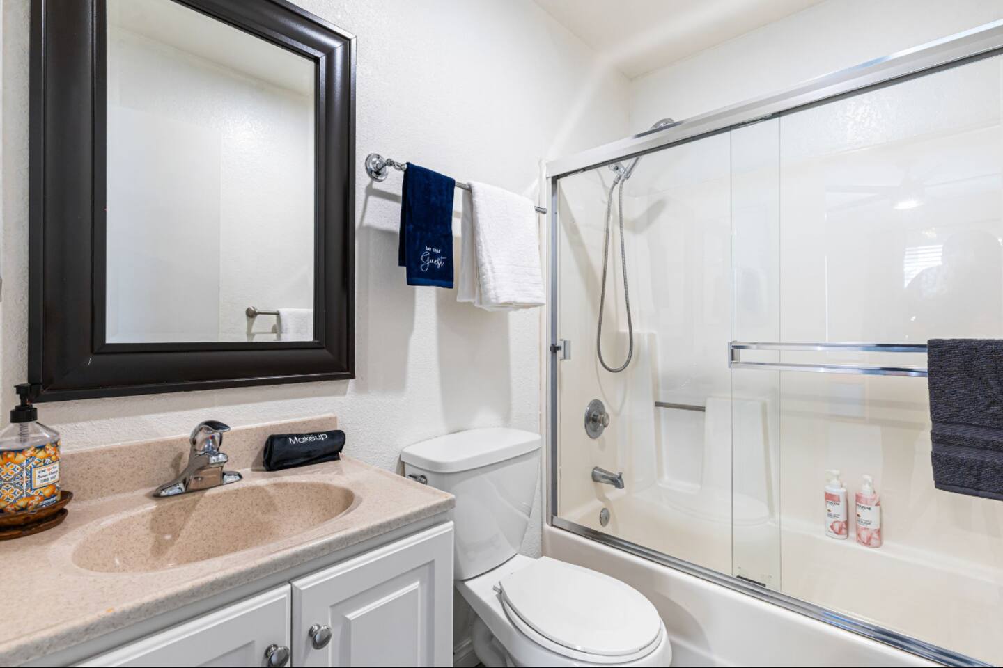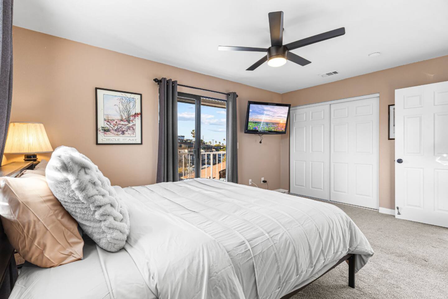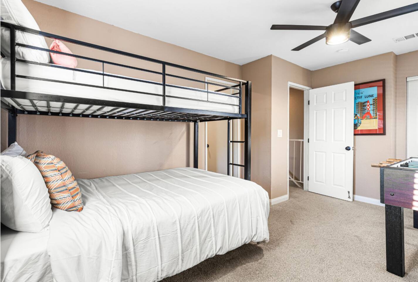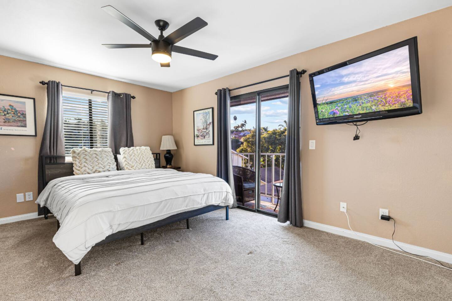 Welcome to your Point Loma retreat! This spacious two-level apartment features 3 bedrooms and 3 full bathrooms, with two bedrooms located upstairs for added comfort and privacy. Enjoy two private balconies and a private patio—perfect for morning coffee, fresh ocean air, or unwinding after a day of exploring San Diego. The open-concept living area offers cozy seating and plenty of natural light, while the shared outdoor space includes a BBQ grill and jacuzzi, ideal for relaxing evenings or a casual gathering. Whether you're looking for a peaceful getaway or a fun stay with friends and family, this home has everything you need. LIVING ROOM & KITCHEN: Settle into a warm, inviting living space with comfortable furnishings and an indoor fireplace. The fully equipped kitchen opens directly to a private patio, making it easy to cook, dine, and relax. A full-size bathroom with a walk-in shower is also conveniently located on this level. DOWNSTAIRS BEDROOM: A cozy queen-sized bedroom is located on the main floor—perfect for guests who prefer to avoid stairs. UPSTAIRS BEDROOMs: Master Bedroom Enjoy a serene king-sized bed, a private ensuite bathroom, and your own balcony where you can sip your morning coffee or take in sunset views. Guest Bedroom Perfect for families or groups, this room features an XL twin-over-queen bunk bed, a foosball table for added fun, and a private ensuite bathroom. SHARED BACKYARD Relax and enjoy a welcoming shared outdoor space complete with a BBQ grill, outdoor dining area, and a 7 person hot tub—ideal for unwinding or hosting a small get-together. MUST KNOW This property is located in the heart of Point Loma, within the airport flight path. You may hear airplane noise between 6:30 AM and 11:30 PM while outdoors. Indoors, with doors and windows closed, the noise is generally minimal. If you’re sensitive to noise and prefer to keep windows open, this may not be the ideal fit for you. NEED BIGGER SPACE? We also have another 3-bedroom, 3-bath unit available in the same building. If your group needs extra space, feel free to let me know—it's perfect for large families or friends who want to stay close to each other.