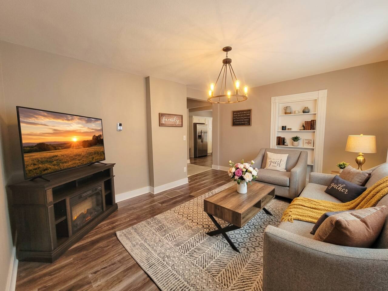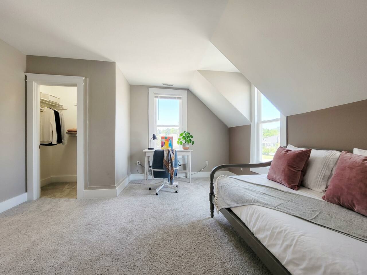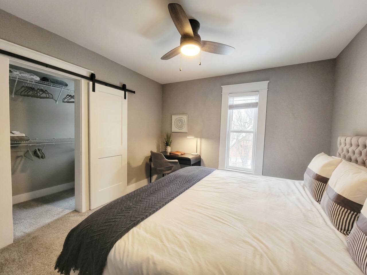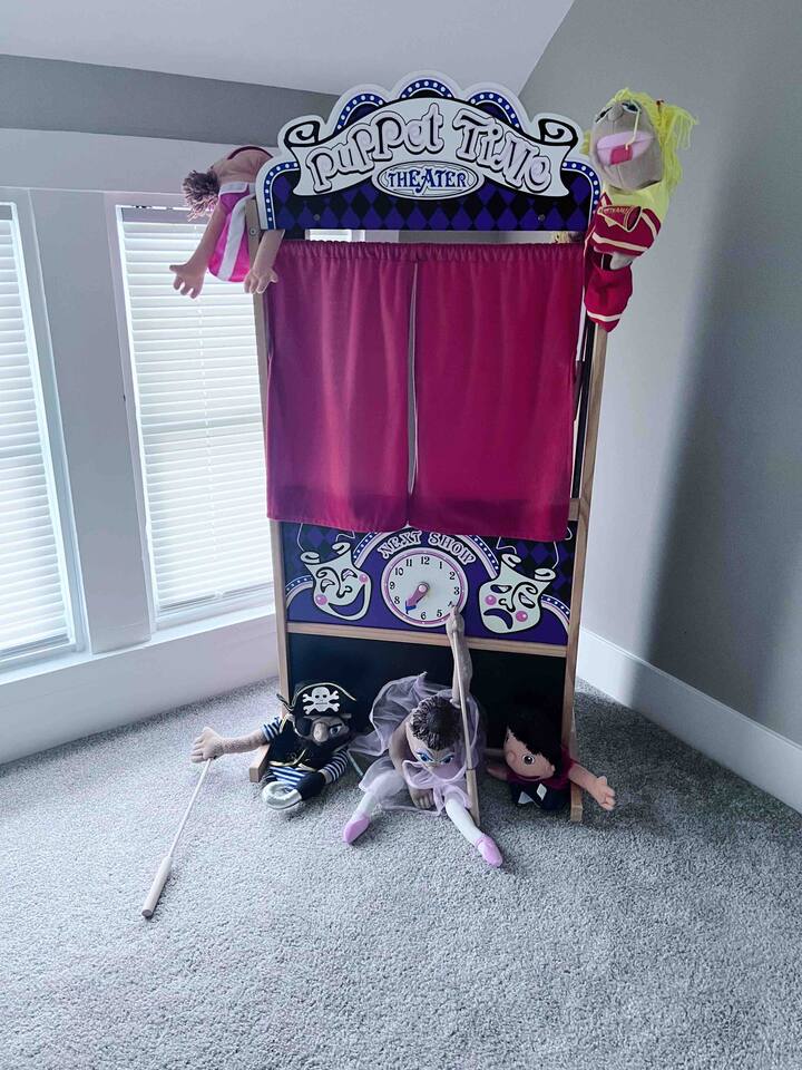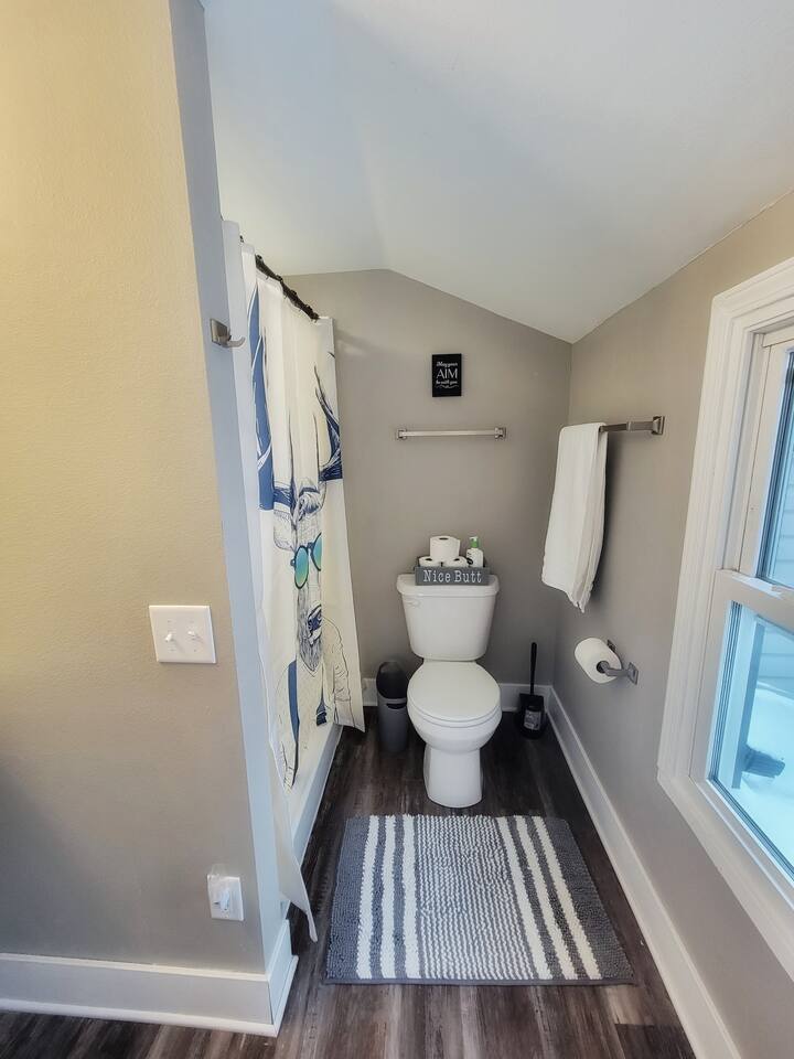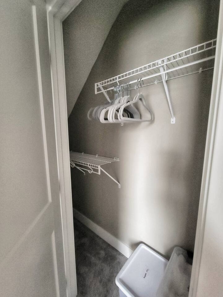 Ground Floor: Bedroom #1 : King Sized Bed- Desk - Walk-in Closet Living room Dining room - 8 seaters Bathroom with Tub & Shower Combo connected to the laundry room Upstairs: Bedroom #2: Queen Sized Bed Bedroom #3 : Full Sized Bed & Twin Sized Bed Bonus Room : Full sized Bed & Twin bed with Desk Bathroom: Shower ONLY